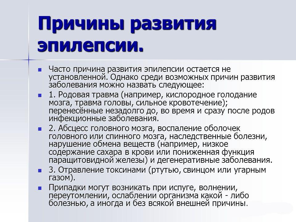 Как правило, эпилепсия развивается на основе наследственной предрасположенности. Мозг таких больных предрасположен к особому состоянию нервных клеток (нейронов) – они отличаются повышенной готовностью к проведению импульса. Взрослые могут заболеть после перенесенной травмы головы или тяжелого инфекционного заболевания. Кроме того, велик риск развития болезни в старческом возрасте, когда мозг «изношен»: особенно после инсультов и других неврологических заболеваний.